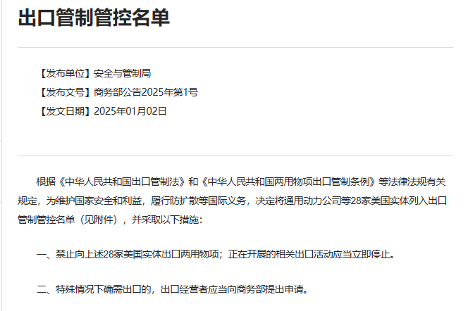 中国商务部于2025年1月2日发布公告,宣布将通用动力公司等28家美国实体列入出口管制管控名单。这一决定是根据《中华人民共和国出口管制法》和…